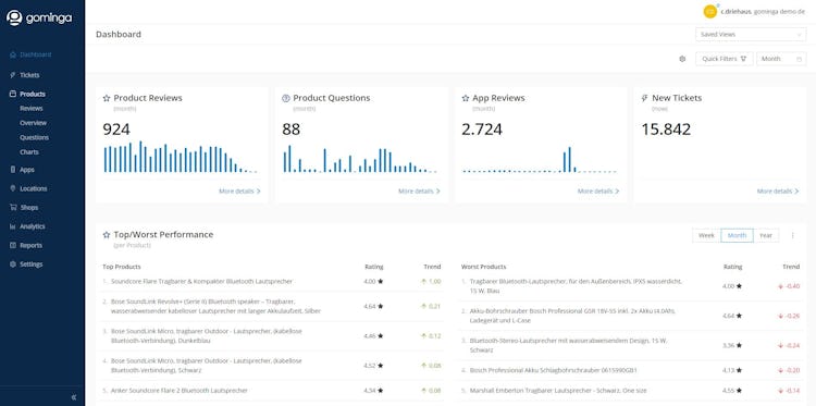 Key features of gominga include activity tracking, customer experience management, customizable templates, response management, sentiment analysis, and review notification. The application allows marketers to manage reviews from across a variety of eCommerce platforms including Walmart, Amazon, OTTO, Zalando, and more. It also offers review management for stores, locations, and services on Google My Business.