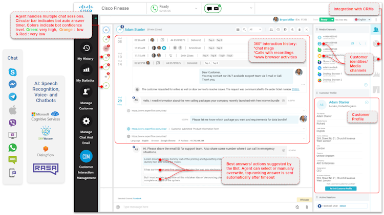 Hybrid Chat is a business-to-customer Livechat solution that unifies customer chats across any channels such as WhatsApp, Viber, SMS, Webchat, Telegram, Facebook Messenger, Instagram, etc. You can use chatbots (Dialogflow, Amazon Lex, rasa.ai, IBM Watson, and more) as primary chat participants or as an agent assistant. It can also be embedded within Microsoft Dynamics CRM, or any HTML5-compatible CRM solution. This allows customer identification from MS-CRM on chat arrival and chat events in CRM for reporting.