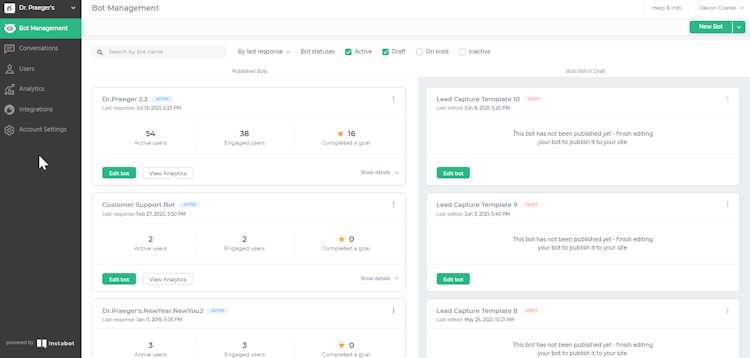 Launching Instabot on your website can be done in 20 minutes or less, and it's easy to edit your bot on the fly. Build and integrate in no time at all, and once deployed, you'll be able to live chat with customers as well as exploring rich analytics and suggestions for optimization. Businesses can also leverage the data that Instabot collects by porting it over to your CRM, e-mail platforms or other portals.