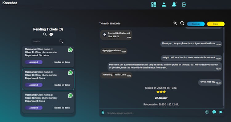 The platform employs an automated ticketing system that generates support tickets for each incoming message on any configured channel. Support agents receive real-time notifications when new tickets arrive and can accept, manage and reassign tickets through a centralized dashboard. A complete chat history is retained for every ticket, preserving context across customer conversations and enabling consistent follow-up.