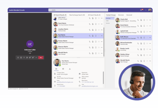 Landis Attendant Console for Microsoft Teams includes multiple transfer options and customizable keyboard shortcuts for call handling. Users can add notes to callers for collaboration. It offers call-back reminders via email or chat. It is a receptionist software for Microsoft Teams that provides call handling features, optimized for front desk operators and receptionists.
