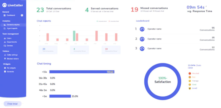 LiveCaller is a live chat software designed to help businesses communicate with customers via various channels such as web calls, real-time messaging, third-party applications, and more. Administrators can monitor, measure, analyze and visualize key performance indicators (KPIs), response time, chat duration, average conversations per day, client satisfaction rates, and other metrics on a centralized dashboard.