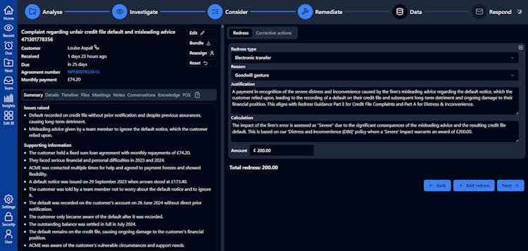 The system features a transparent AI architecture that blends generative AI with expert human oversight to make complaint handling faster, more consistent, and accurate. Its core functionality breaks each case into manageable steps with explainable outputs that require human validation, ensuring accountability throughout the process. The platform includes intelligent categorization of complaints, vulnerability support for sensitive cases, AI-generated response drafting, and comprehensive root cause analysis capabilities. An integrated data warehouse provides detailed reporting on resolved complaints, real-time insights on emerging issues, and seamless generation of regulatory returns, enabling organizations to track trends, audit complaint investigations, and continuously improve performance.