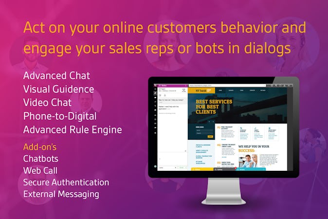 Vergic Engage is a digital engagement platform that enables businesses to connect to online customers through advanced chat, chatbots and video/voice. Other features include collaboration tools such as co-browsing and screen/file sharing and an analytic engine which allows businesses to prioritize high value customers, personalize dialogue, and select the best communication channel for every interaction.