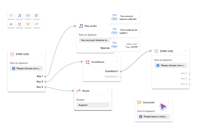 Design IVR logic, routing trees, conditional workflows, and cross-channel journeys using a zero-code drag-and-drop interface. Integrate with CRMs and external systems via APIs and webhooks.