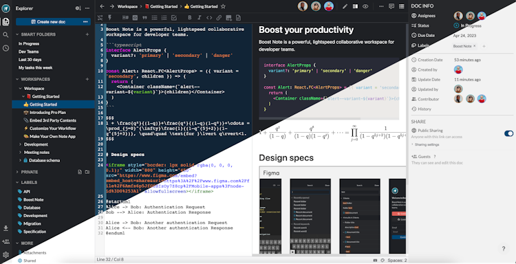 Boost Note is a document-driven project management tool. This app lets you organize your dev teams sprint backlog and visualize them with status, assignees, reviewers, due date, and everything you need. Boost Note has a powerful markdown editor that makes it easy to write a tech spec with charts, js, mermaid, latex, plantUML, and so on.