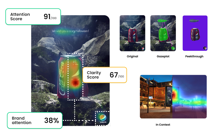 Brainsight generates predictive heatmaps that highlight areas of high and low visual attention. Gazeplots map the natural sequence of visual exploration and Peekthroughs reveal elements that are seen instantly versus those that are overlooked. The platform computes two benchmarked metrics. The Attention Score estimates the likelihood that a design will capture viewer attention within its context. The Clarity Score evaluates visual comprehensibility and design effectiveness. The achieved accuracy closely matches outcomes from live eye tracking studies.