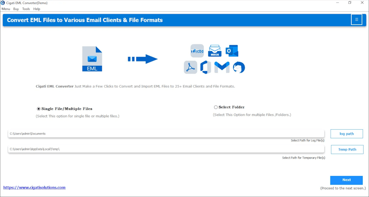 Cigati EML Converter is an enterprise grade email migration and conversion software designed for large scale archive management. The solution is targeted at IT administrators and data migration specialists requiring transformation of email data across multiple formats and cloud based platforms while preserving complete data integrity. The platform provides a unified interface that guides users through selection of source data, specification of output format, application of filters and execution of conversion tasks. The software accommodates both individual file operations and bulk processing of entire folder structures in a single execution.