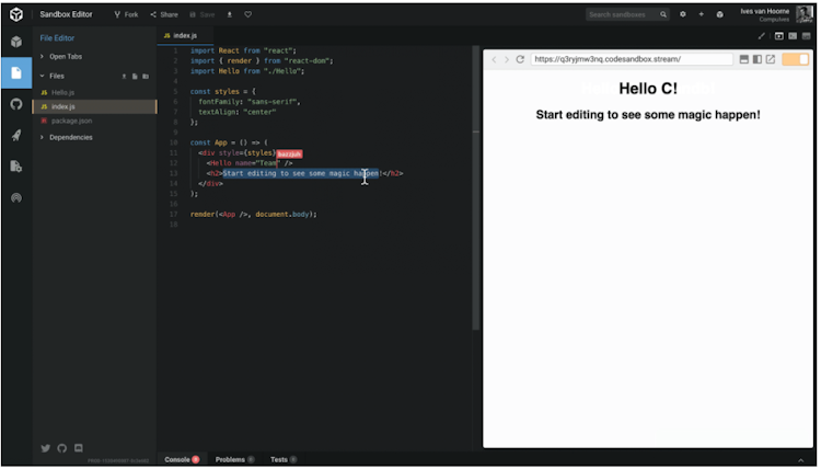 CodeSandbox is a development environment for web applications that can be accessed with a browser. No setup is required, so it is possible to get started right away. Sandboxes can easily be shared with teams or colleagues and it is possible to create as many sandboxes as required. Using the live updates functionality, codes are immediately executed, which makes it possible to see results directly in the sandbox. Sandboxes can be linked to GitHub.