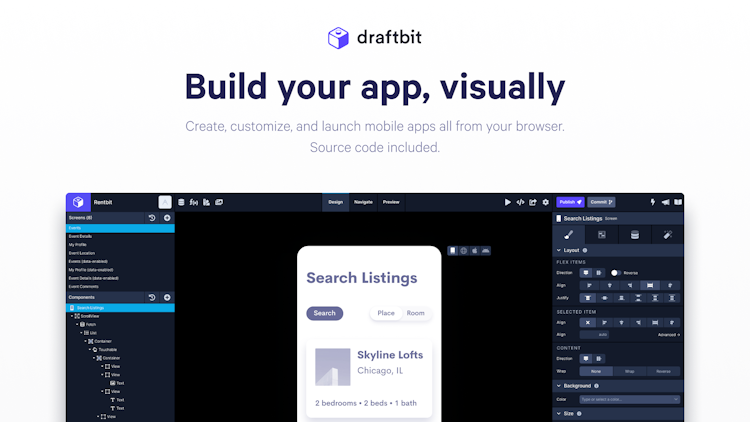 Draftbit is a web-based app building software designed to help businesses create, launch, and customize mobile applications from within a web browser. The platform lets teams penalize every detail of the application using advanced properties, custom codes, and themes.