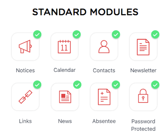 Digistorm Apps support a range of customised school app modules from which users can pick and choose to build the perfect school app. Standard modules include notices, calendar, contacts, newsletter, links, news, absentee and password protection, while premium modules offer features such as business directory, custom notices, single sign-on, timetables, sports and performing arts.