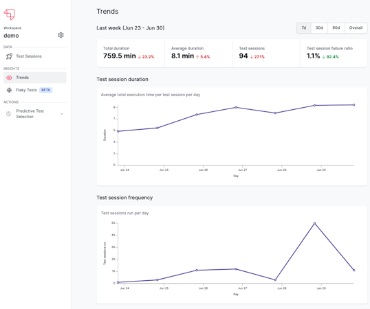 Test Session Duration Insight: Identify an increase in test session time which implies that the developer cycle time has been trending up