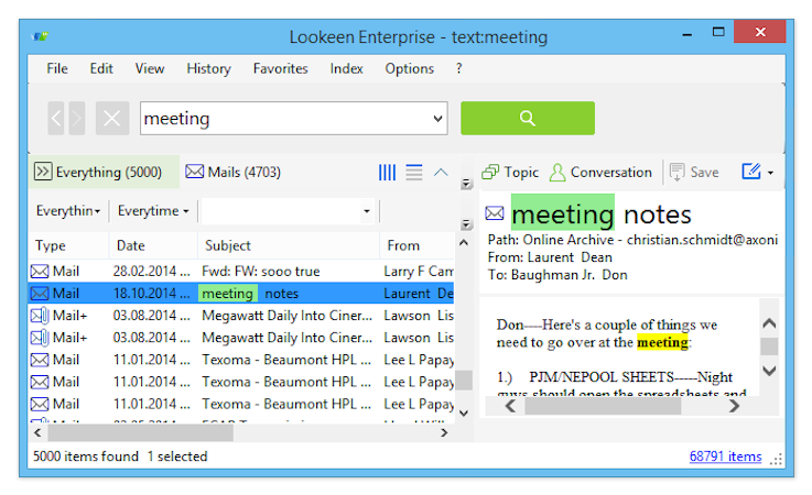 Lookeen is a Windows-based enterprise search software that helps businesses find specific information across emails, attachments, tasks, notes, contacts, files, folders, and more from within a unified platform. It allows staff members to utilize the search query and filter functionality to preview documents and images.