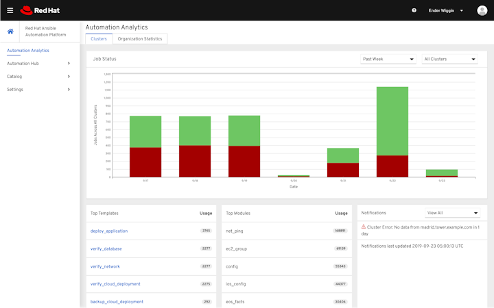 The solution’s automation services catalog grants access to resources available across physical, virtual, cloud, and container environments. IT teams can request new automation projects with details such as CPU limits, requests, or memory limits and track the requested orders by their approval statuses or date of order. The dashboard helps supervisors collect and analyze data, receive health notifications about expiring clusters, generate reports on the status of deployments, and monitor pending or failed jobs.
