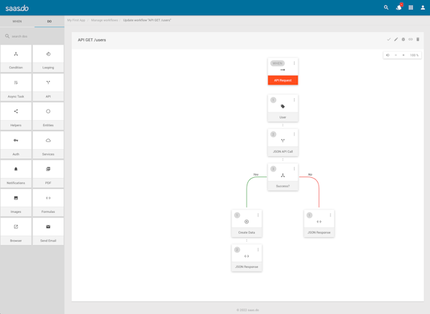 With saas.do you can create your own web app through visual programming. Structure your data with our entity builder and automate your app with workflows.