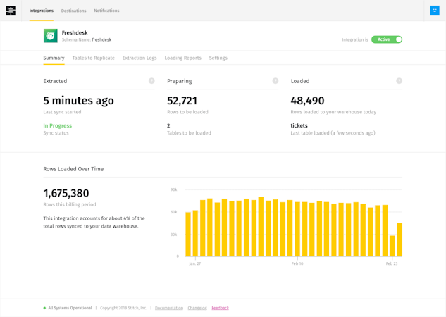 Stitch offers an API, which lets businesses integrate the system with several third-party platforms such as MailChimp, Salesforce, Google Analytics, Facebook, MySQL, Freshdesk, and more. Other features include data synchronization, automated notifications, key management, GDPR compliance, and reporting.