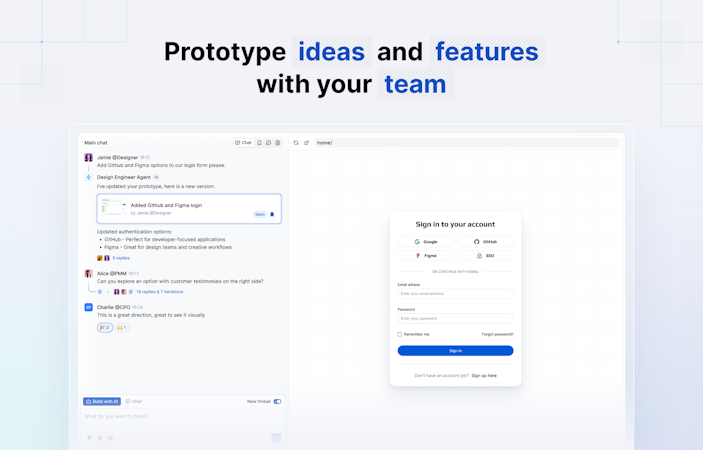 Built-in collaboration - explore features in threads, leave comments and reactions, and involve your team to gather fast, meaningful feedback.