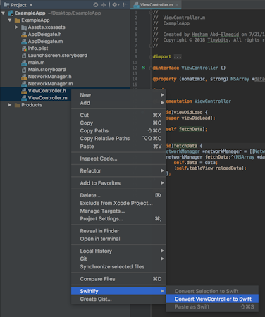 Swiftify provides an AppCode plugin, which allows developers to simultaneously process and convert .h & .m file pairs, as well as update Xcode project files using a built-in parser. The solution also offers integration with Mac Finder, letting members merge declarations, such as variables or functions, from header and source files.