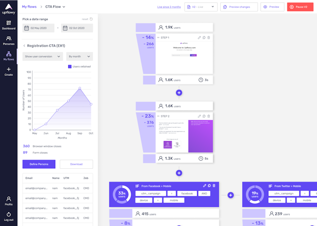 The Upflowy platform can begin from a standalone URL or be triggered by a button click or form submission on your own website. Within the flow creation, one can preview edits without disturbing a live flow. We focused our analytics capability on being as granular as possible with step-by-step data collection to ensure drop-off is measured incrementally. The clear analytics dashboard helps identify pain points within your flow, while overlaying data on the flow allows straightforward experimentation and iteration.