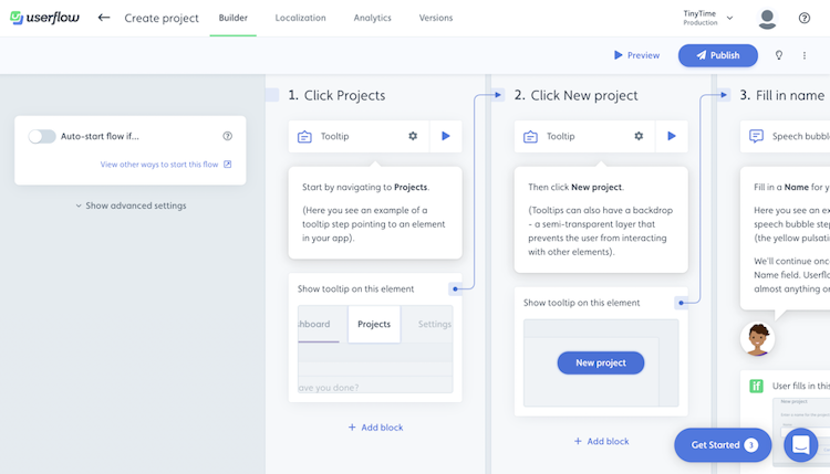 Userflow is a no-code user onboarding platform that enables software providers to create product tours, checklists, and surveys without requiring developer resources. The platform functions as an overlay on existing applications, incorporating tooltips, modals, and buttons to guide users through the product experience. The Kanban-style builder offers a drag-and-drop interface that simplifies the creation process, allowing teams to preview flows immediately within their applications and launch them within minutes.