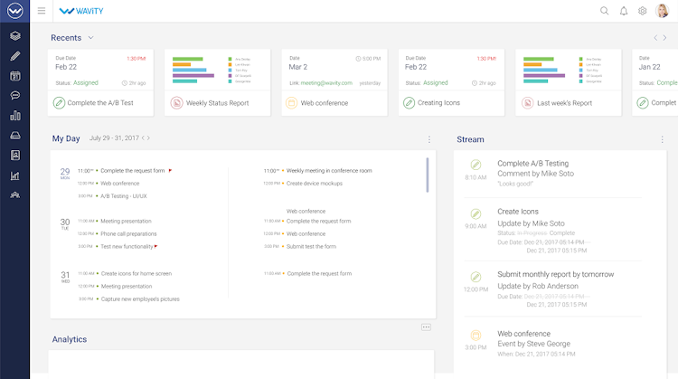 Wavity scores very highly on User Experience (UX) measurements. There are three reasons for this. The first is that Wavity has led the product development with a user-centric approach. The second is that with our widget-driven UI, users can customize the look-and-feel to what they need and how they want to view things, thereby making the UI their own. The third reason is that the application is role aware. So, depending on a person’s role in an organization, they are presented with only those things that are pertinent to them and are needed to get their work done.