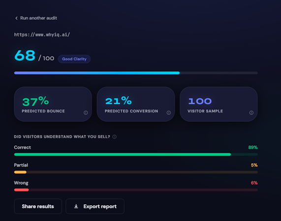 Every analysis generates a unique shareable link for collaboration and advanced tier plans support PDF report exports with complete visitor breakdowns and recommendations. White label reporting capabilities streamline agency workflows by automating manual conversion rate audits into client ready deliverables. API support is available to facilitate custom integrations with external systems and tools. The behavioral simulation architecture randomizes visitor profiles and conditions to produce variability between analyses, mirroring real user responses and ensuring reliable identification of conversion barriers. WhyIQ distinguishes itself as a pre traffic CRO solution that delivers quantified multi archetype behavioral analysis in place of subjective single perspective feedback.