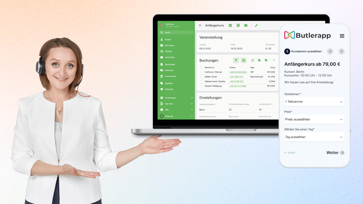 Butlerapp is a browser-based course management software that helps companies effectively organize and manage their courses, seminars, webinars and individual appointments. The software offers individual adaptation to operational processes and enables intuitive management of courses, customers and invoices. Adapting the booking system to the corporate design enables a seamless brand look and feel.