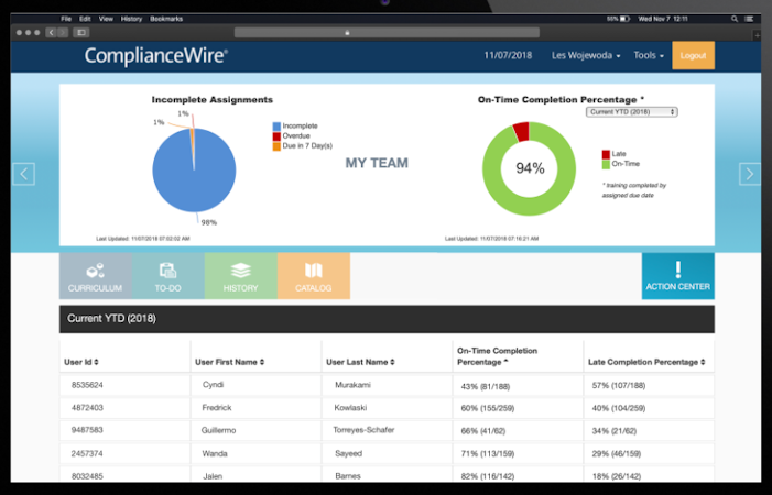 ComplianceWire enables enterprises to customize course content by including critical workplace subjects such as GxP training, employee confidentiality, sexual harassment, or site security in training materials. Users can generate qualification reports to evaluate the training effectiveness and eligibility of employees. It comes with an administrative dashboard, which helps managers access to-do lists or catalogs, and track team performance using charts.
