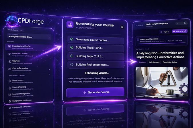 CPDForge is an AI-powered compliance training and intelligence platform designed to help organisations generate, manage, and maintain regulatory training at scale. The platform combines course creation, regulatory monitoring, workforce analytics, and audit reporting into a single system, enabling businesses to stay compliant. With CPDForge, organisations can automatically generate structured training courses in minutes. AI builds complete modules including learning objectives, lesson content, assessments, and supporting materials, ensuring consistency and alignment with industry standards.