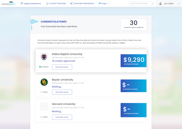 DegreeSight is an ecosystem that helps students find and select their target schools, then determine a cost-and-time effective path to graduation using their unofficial transcripts and a selected major, saving thousands and increasing their likelihood of enrollment.
