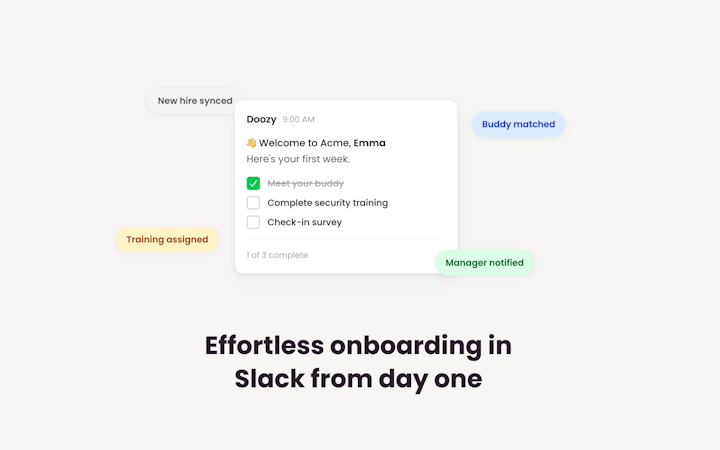Doozy is an employee engagement platform built natively within Slack that automates workflows for onboarding, training, and team engagement. It consolidates manual onboarding processes, standalone learning management systems, and fragmented engagement tools into a single application that operates entirely within the Slack environment. HR and people operations professionals, learning and development specialists, sales enablement teams, and customer success organizations utilize this solution across both startups and large enterprises. The platform accommodates fully remote and distributed teams seeking scalable methods to maintain company culture, deliver structured training programs, and manage new hire experiences without manual intervention.