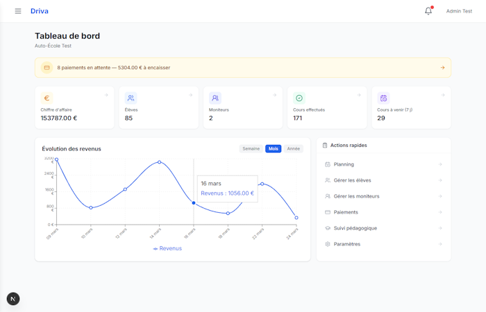 The scheduling system manages instructor availability, lesson slots, and booking conflicts across weekly and monthly calendar views. Learners reserve driving sessions through real-time online booking. Student management functionality includes digital dossiers that track purchased, scheduled, and completed hours and monitor progress for theoretical and practical examinations. The financial management module processes online payments via Stripe integration, generates PDF invoices, and administers payment schedules and installment plans. Pedagogical tools encompass code examination preparation, driving circulation tests, interactive quizzes, and curriculum workbooks. Automated notifications deliver confirmations, session reminders, and email alerts to reduce no-shows and administrative follow up.
