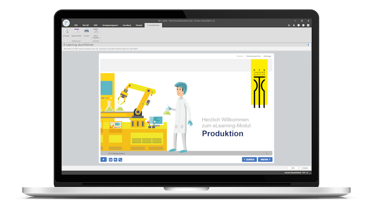 A particularly advantageous aspect is the ability to seamlessly integrate content from the electronic document management system (eDMS) and the electronic quality management system (eQMS), which means that documents such as specifications and standard procedures can be easily integrated. The e-learning modules go directly into the user's area of responsibility and can be processed immediately.