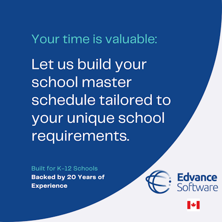 • Edvance Software helps to create student schedules. Their timetabling module makes it easy for administrators to respect constraints and avoid conflicts while optimizing workflow. The product avoids the need for outsourcing the scheduling process but they also offer a stand-alone Full Scheduling Service.