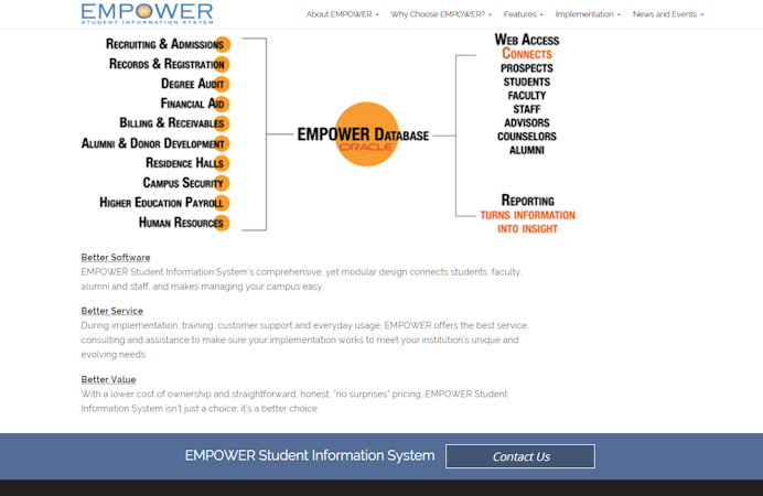 EMPOWER is a student information system that allows schools to maintain and manage student data. The solution can be deployed on the cloud or hosted on clients' premises and can be accessed through a web based portal. It is an integrated solution for all key members of a school including students, teachers, faculty, and parents. The solution manages the entire student life cycle, from leads to placements. The software is suited for the needs of small and medium sized institutes across the US. Some of the key customers are Nebraska Christian College, Benedictine College, Calumet College of St. Joseph, Covenant School of Nursing, Geneva General Hospital Schools of Nursing and Unites States Sports Academy.
