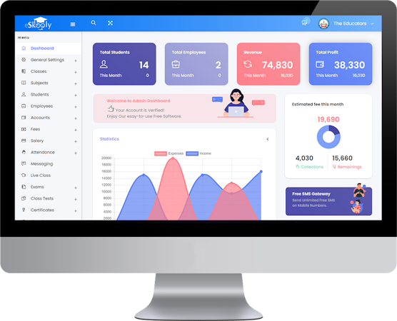 eSkooly offers various modules for handling admin, staff, and student panels, exams, salary and expense processes, and inventory, among others. Some features include data visualization, file sharing, and SMS alerts. Schools, colleges, universities, and tuition as well as training centers. can print reports, admission slips. job letters and report cards.