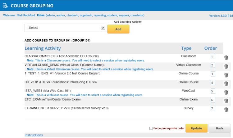 eTrainCenter supports SCORM content, allowing users to import existing courses bought off-the-shelf, exported from another LMS, or created in SCORM-compliant authoring software. Users can also create their own courses and manage content with support for text, images, Microsoft PowerPoint presentations, PDF files, Macromedia Flash files, and video streaming through various players. Custom certificates can also be created automatically upon course completion from uploaded certificate templates.