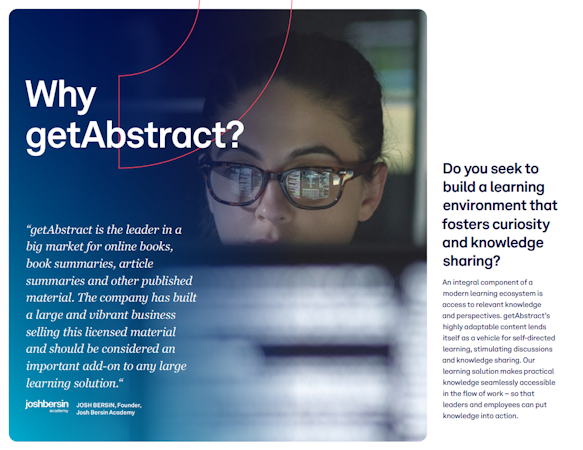 The right insight at the right time can make all the difference. In addition of getAbstract to any learning solution can be crucial as it saves L&D teams a significant amount of time that would otherwise be spent searching for and assessing content. The solution's goal is to make it easy for leaders and employees to stay informed about relevant business developments and enhance their performance by presenting expert knowledge in a consistent and easy-to-understand format.