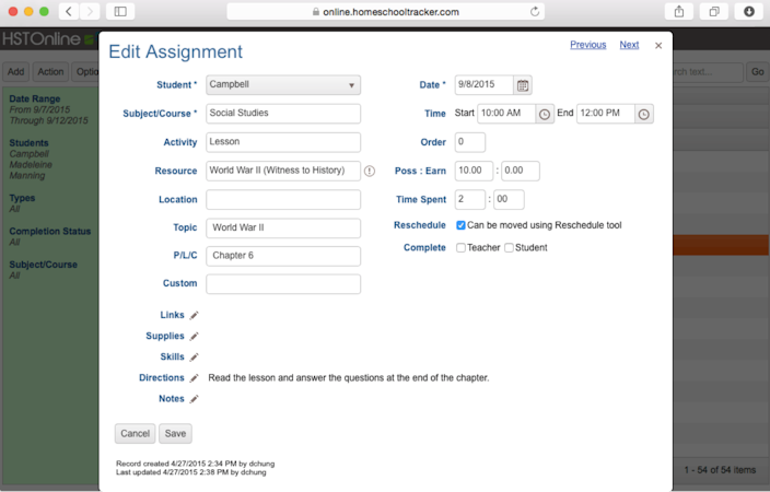 Homeschool Tracker allows users to create records of work for students, create assignments in advance, and assign lesson plans to students according to the curriculum. The platform enables instructors to create complete days for students including outside activities and school work. Users can also enter grades for their students' work, create grading scales, and set up weighted grading.