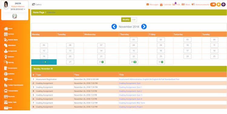 Schools can manage attendance and grades, schedule events such as parent/teacher conferences or PTA meetings, assess student progress via quizzes, tests and assignments, post announcements and much more through K12NET’s intuitive interface.