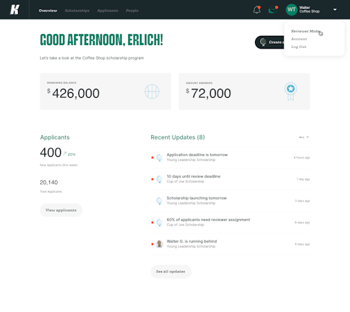 Kaleidoscope is a cloud-based platform that enables organizations to fund, design, administer, and host beautifully branded scholarship and grant programs. The platform uses leading technologies to deliver an end-to-end solution for organizations and connect them to our awards marketplace.