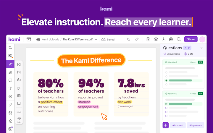 Kami is your go-to PDF annotator and so much more. Accessible tools keep students engaged, and streamlined instruction and assessment save teachers time. What’s more, Kami’s seamless integrations with learning management systems help simplify workflows and ensure instant access for all.