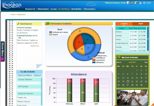 The platform comprises integrated feature streams that address distinct aspects of educational management. The ERP stream lets stakeholders manage physical and financial operations with modules that cover administration, admission and registration, automated timetable generation, student attendance management, library management, transport management, inventory management, examination management, and comprehensive payroll, finance, fixed assets, and budgeting tools. The knowledge management stream focuses on intellectual aspects with course management functionality, interactive knowledge exchange tools, e-library resources, and online test management systems that deliver, track, and personalize learning content for individual learners. The performance tools stream addresses emotional aspects through K Perform, an advanced performance evaluation tool that maps emotional factors alongside academic metrics and includes role specific dashboards for student, teacher, parent, and institutional management.