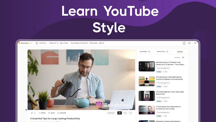 Learninghubz offers an intuitive and enjoyable user experience, resembling popular platforms such as YouTube. It provides personalized features, including custom recommendations, tailored playlists, and content that can be shared among users. Organizations have the convenience to construct online learning academies that reflect their workforce's objectives and requirements.