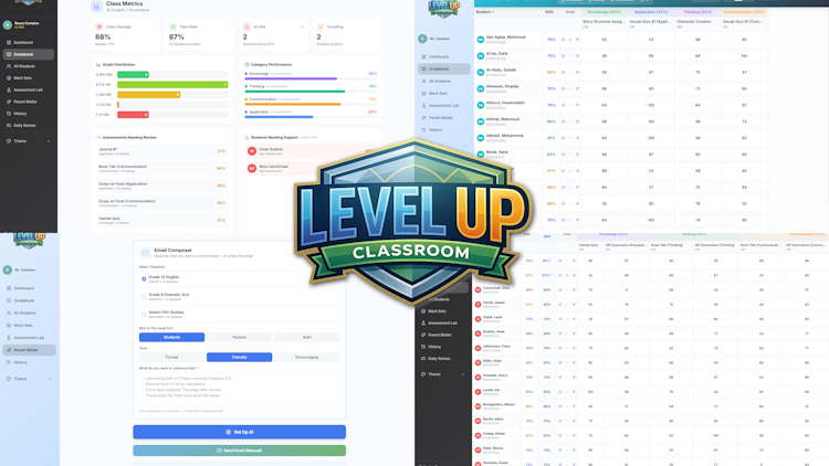 Level Up Classroom is a comprehensive classroom management software platform designed for K-12 educators seeking to integrate gamification elements with traditional academic assessment tools. The platform combines a customizable gradebook system with artificial intelligence-powered features to streamline administrative tasks, enhance student engagement, and facilitate communication among teachers, students, and parents. It supports educational frameworks in Canada and the United States, including Ontario Knowledge and Thinking Categories and strand-based grading, while maintaining flexibility to accommodate any custom grading system or state standards.