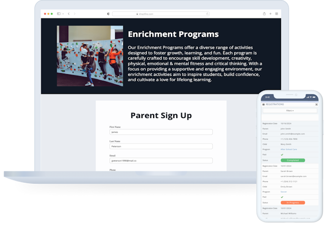 • Parent & Staff Communication Tools - Send automated updates, direct messages, and digital forms to parents and staff. Keep everyone informed through integrated communication threads and announcements.