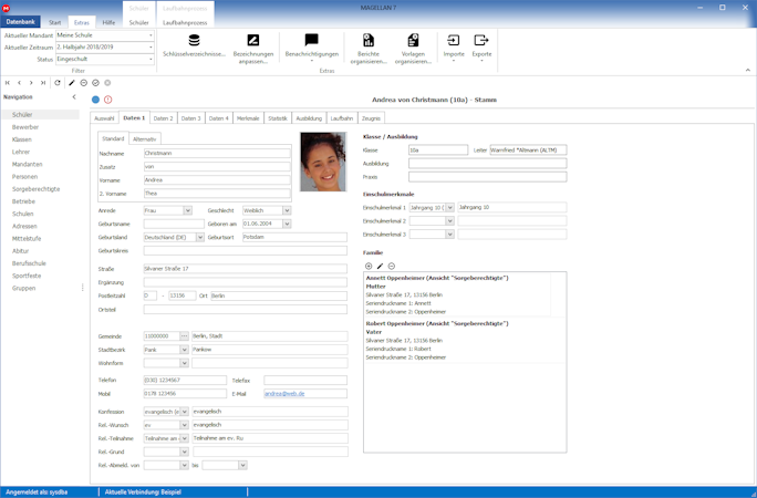 The basic module includes a database that can store all kinds of personal information about students, teachers, and contact details for legal guardians. MAGELLAN also includes a communication tool that can be used to contact teachers and students via email or SMS. It manages books and learning materials in a centralized database. There are also software modules specifically designed for different types of school systems, including high schools and vocational institutions. The additional modules offer various functions to support high-level course administrations, such as the calculation of course marks for vocational school qualifications.