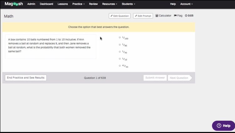 Magoosh lets students select specific subjects and set up difficulty levels to access practice sessions in a quiz mode. Trainees can also analyze performance reports based on subjects, difficulty levels, and question types.