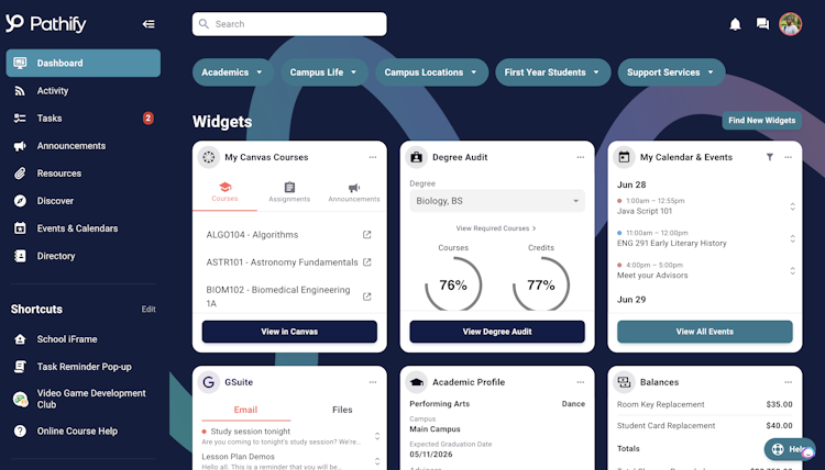 Pathify, the industry’s only Campus Experience Platform (CXP), delivers the new standard for higher ed technology — a unified, personalized digital hub connecting the entire campus community.