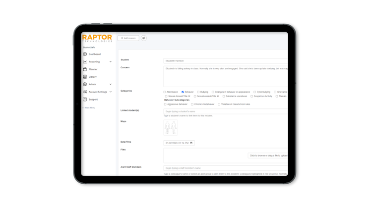 Raptor StudentSafe is a student wellbeing and safeguarding solution built specifically for K-12 schools and districts that recognize the growing need to proactively identify, manage, and support student concerns before escalation. StudentSafe brings together the systems and stakeholders involved in student wellbeing into a single, secure platform, empowering staff to log concerns, intervene earlier, and support student success.